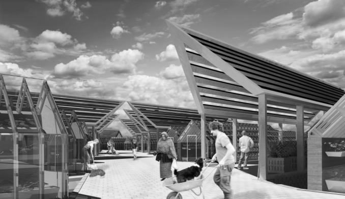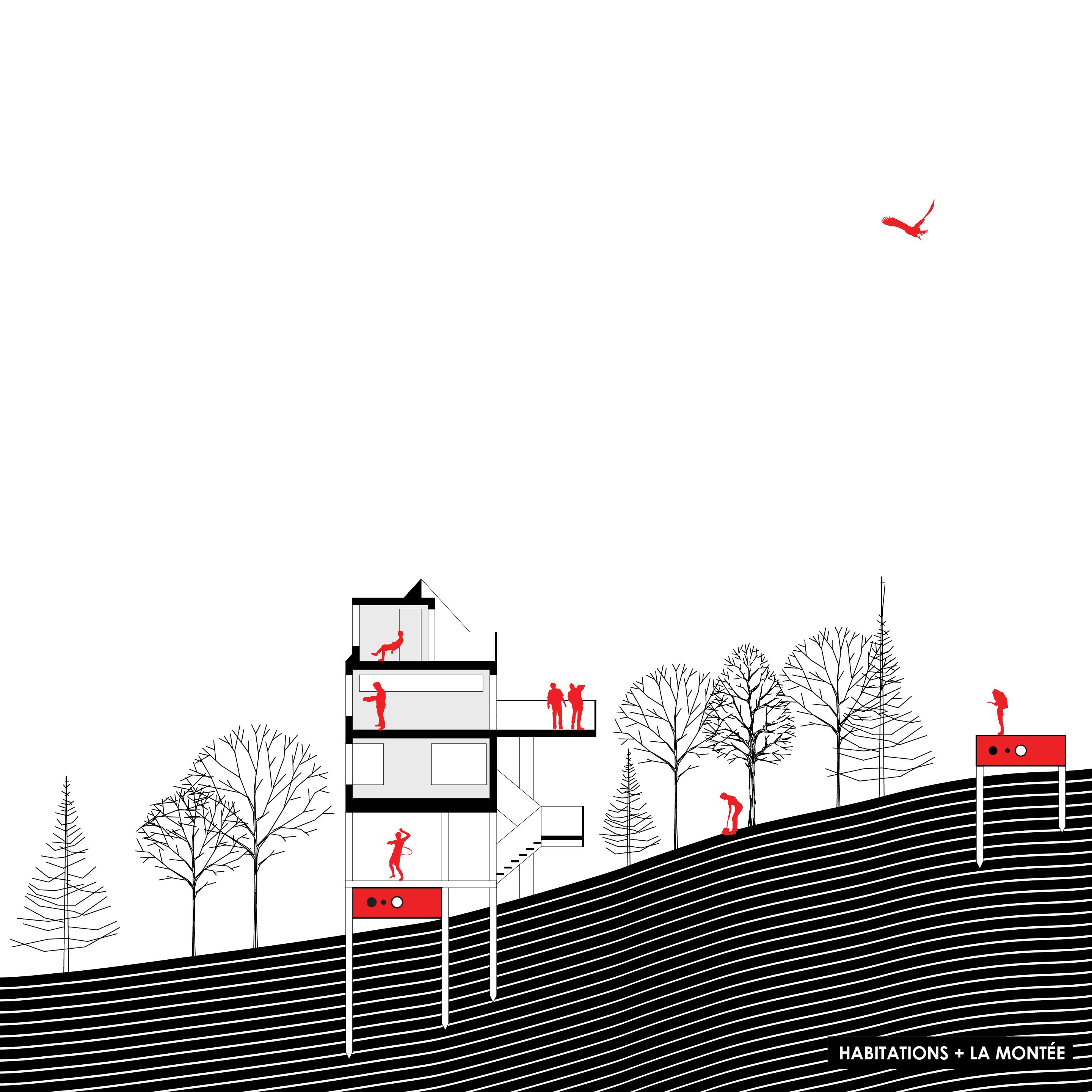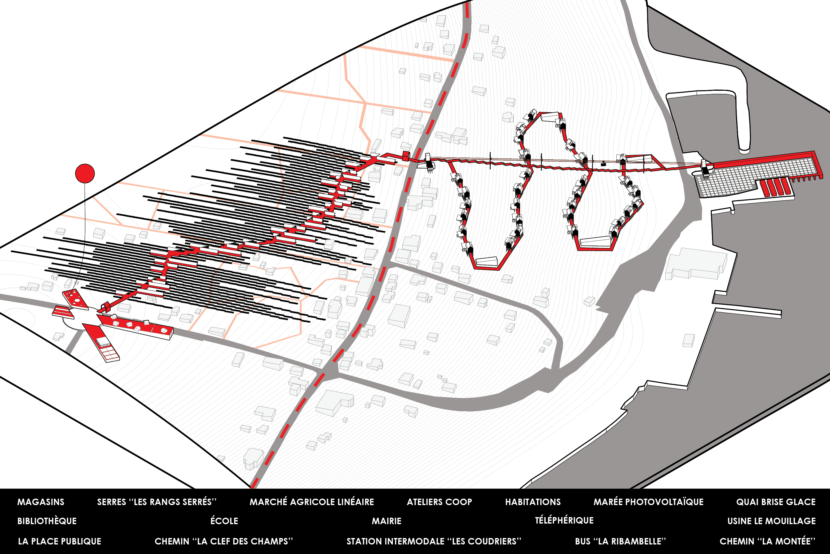 Inspiré par un désir d’autonomie et par la volonté d’explorer un quotidien alternatif où la notion de mobilité est bouleversée, le projet cherche à s’imprégner de la nature et des habitants de l’île. Dans un grand geste filiforme, la communauté existe à travers et aux côtés de la ville véritable. À mi-chemin entre le projet architectural et le design urbain, l’implantation du projet lui permet de profiter de la topographie marquée de l’île. Le projet se veut une parenthèse, une façon de vivre autrement nos relations sociales et l’éloignement sur notre territoire.