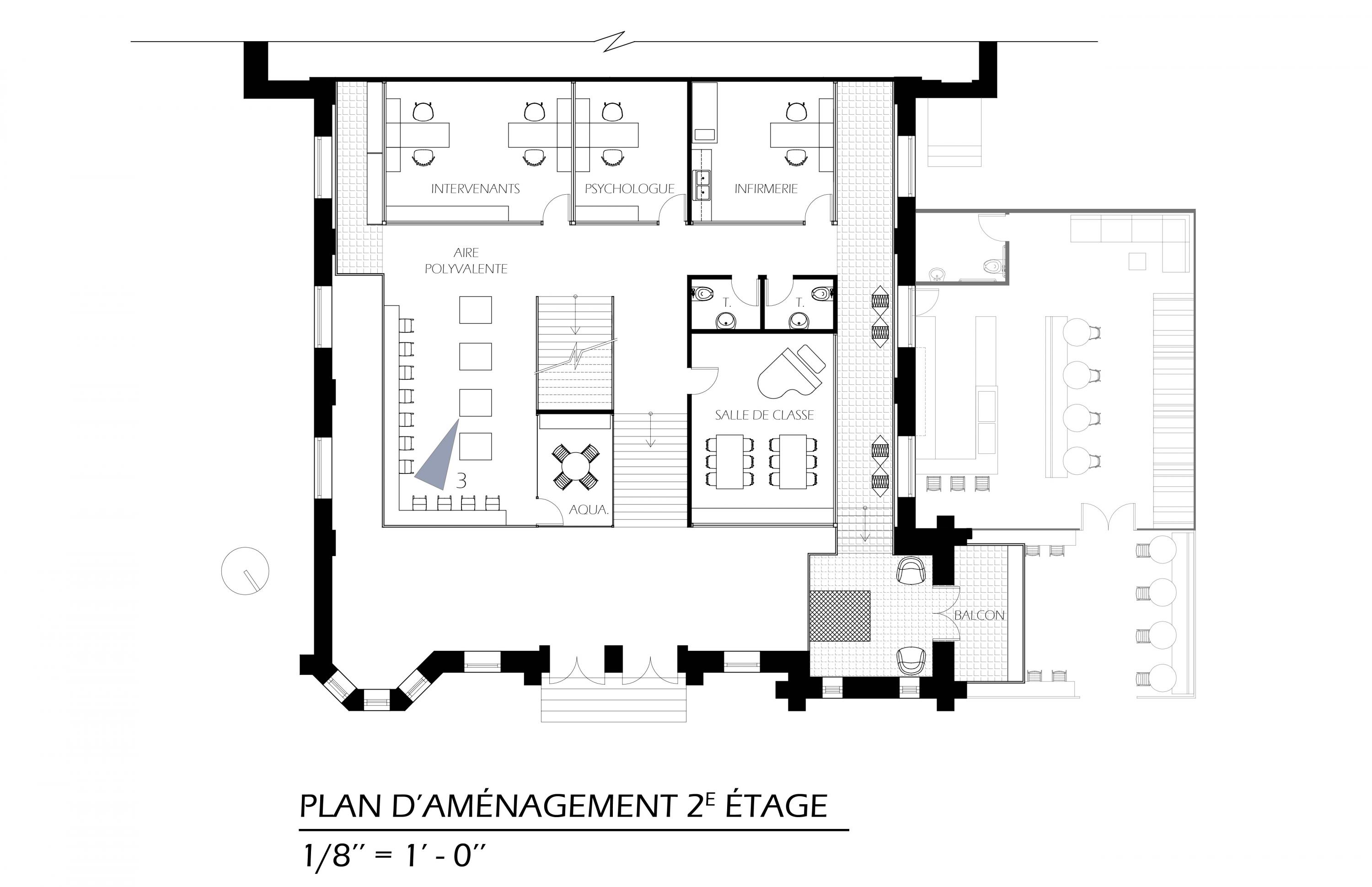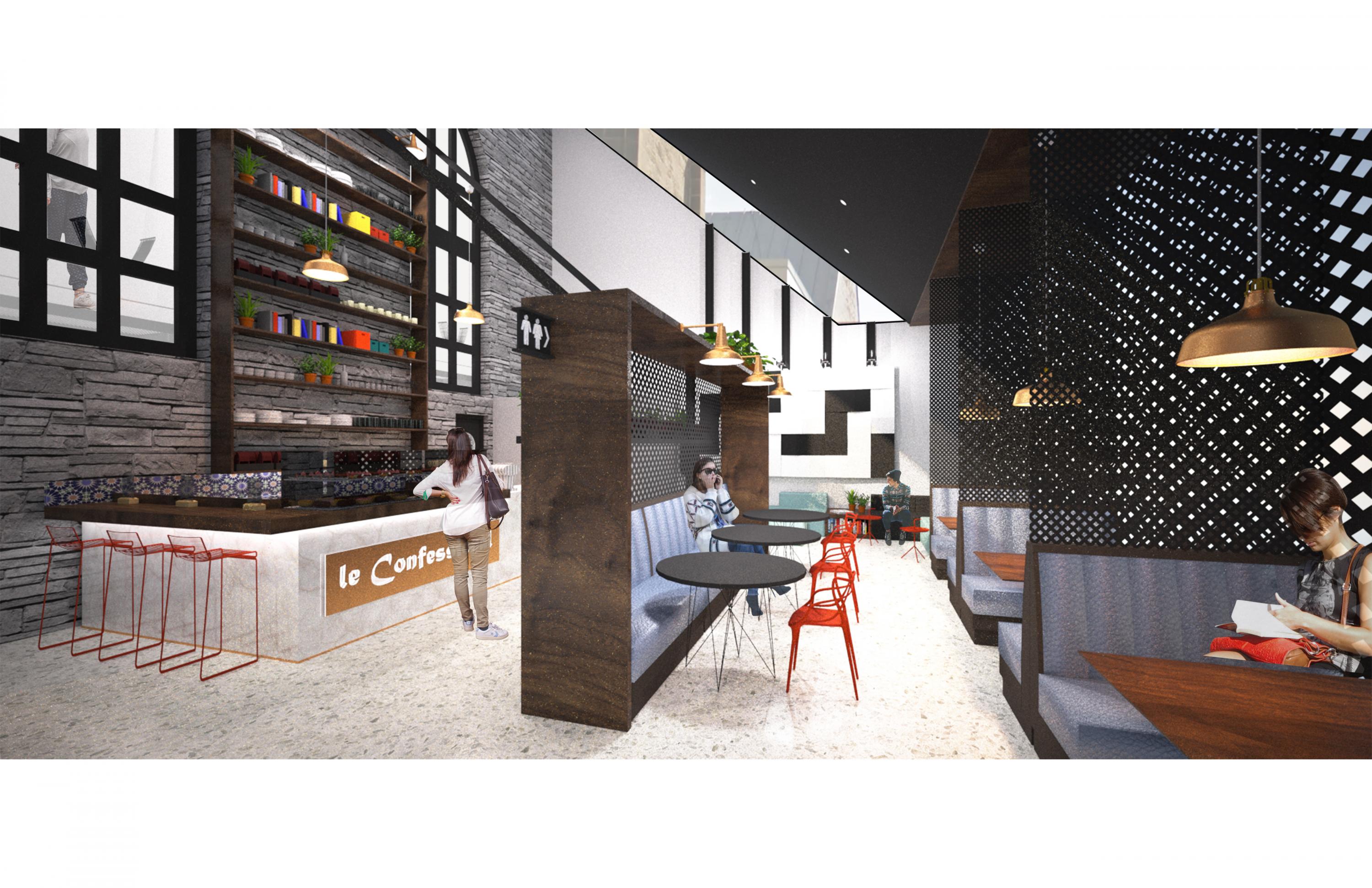 Ayant pour principal objectif de briser les tabous liés à la maladie mentale et à ceux qui en souffrent, le centre de jour le Confessionnal accueille les individus en marge de la société et sert de rampe de lancement à leur réinsertion au sein de celle-ci. Son espace café ouvert au public permet aux usagers de côtoyer le monde extérieur dans un environnement encadré et sécuritaire tout en permettant aux membres de la communauté qui fréquentent le café d'apprécier la capacité des personnes aux prises avec la maladie mentale de vivre en société. La portion privée, quant à elle, est aménagée en un noyau central au sein du bâtiment principal, reflétant l'individualité de ces gens par rapport à la conformité de la société. Un bloc de circulation central haut en couleur guide les participants vers les niveaux supérieurs où a lieu une panoplie d'activités telles que des rencontres avec des spécialistes, des ateliers de cuisine, de musique et d'art, ainsi que l'accès à une salle d'entraînement. Le Confessionnal prône le libre-choix des participants de même que la transparence, c’est pourquoi une passerelle permet aux usagers de se retirer au besoin tout en observant le va-et-vient du café, sans toutefois avoir à traverser du côté public. Changer la perception de la société et surtout celle des participants face à eux-mêmes pour idéalement parvenir à banaliser la maladie mentale, voilà le mot d'ordre du centre d'intervention le Confessionnal.