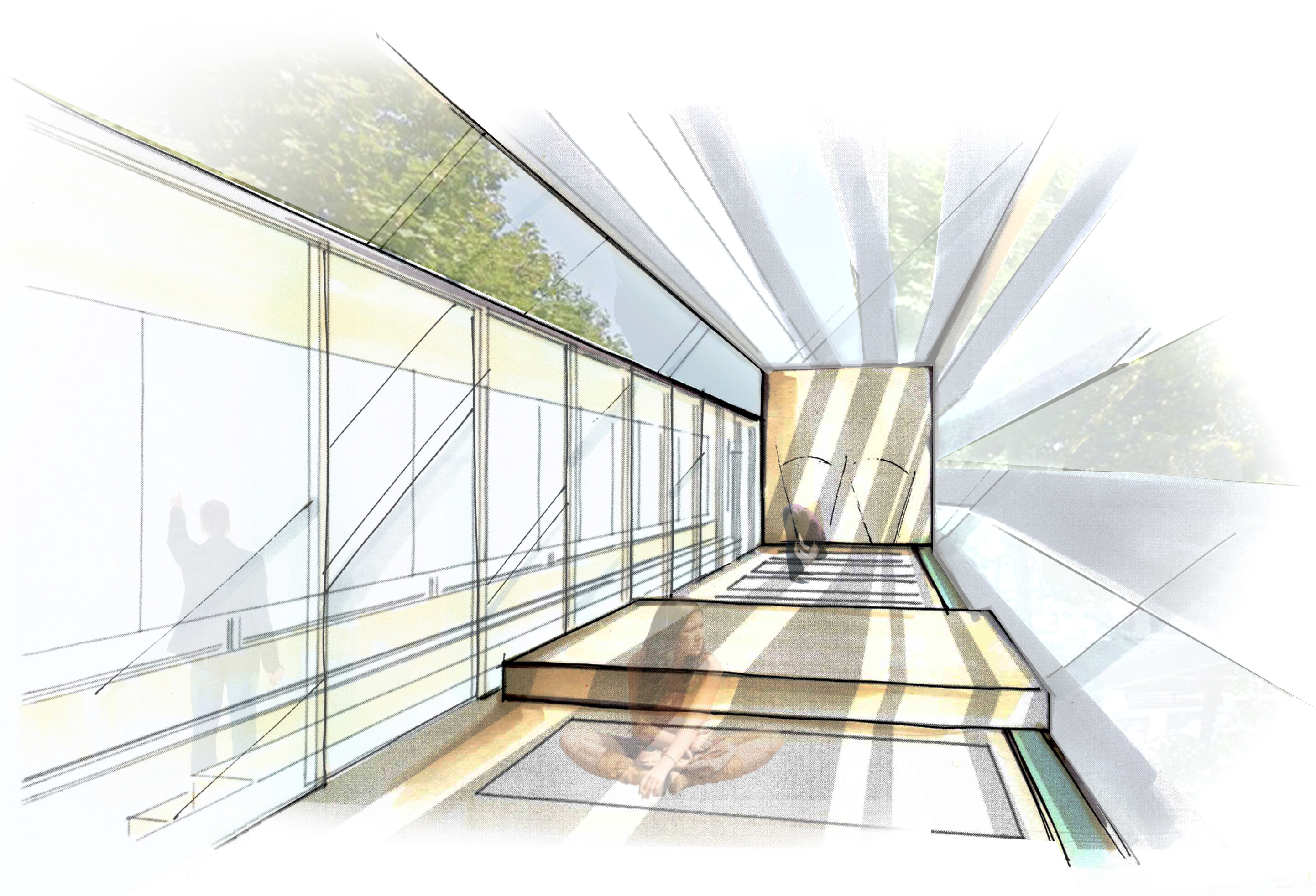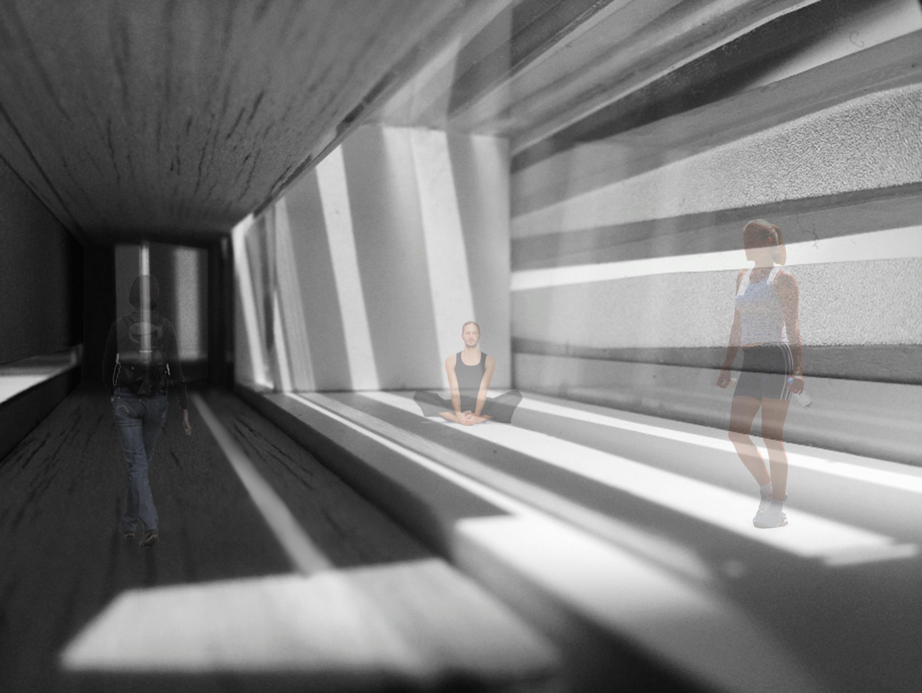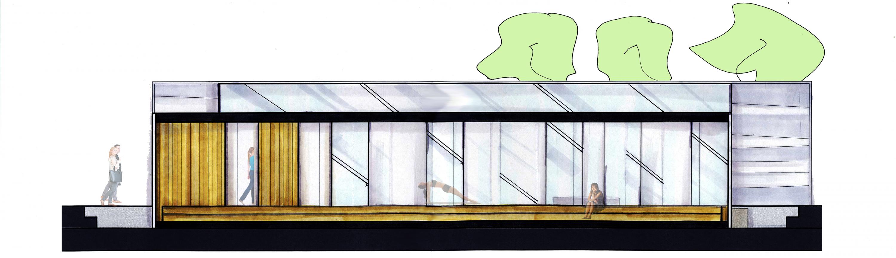 Implantés dans divers quartiers de la métropole, ces centres novateurs visent à optimiser leur utilisation par l’accessibilité de leurs emplacements stratégiques. On crée un lien d’appartenance avec l’usager qui peut se ressourcer à même son milieu de vie. Dans ce projet-étude initialement situé au square Victoria, l’expérience du bâti se retrouve intrinsèquement liée avec la linéarité de l’espace. Tel une artère ajoutée à l’environnement, le centre devient en soi un nouveau passage dans le parc et offre une dimension esthétique minimaliste où seul l’essentiel est présent. En raison de son sens premier, l’espace intérieur offre un lieu simplifié et élémentaire divisé en deux zones distinctes et contrastantes par leur matérialité. Dès l’entrée, l’usager se sentira enveloppé par la zone de circulation rehaussée de bois alors qu’il se verra transporté dans une ambiance ultra lumineuse dans la zone studio constituée entièrement de fenêtres. L’architecture extérieure vient définir l’espace dans son intégralité grâce à une structure ajourée qui laisse entrer la lumière naturelle. Celle-ci, en étroite relation avec l’expérience fondamentale du lieu, permet de faire ressentir à l’usager différentes sensations physiques telles la chaleur, la lumière et le mouvement.