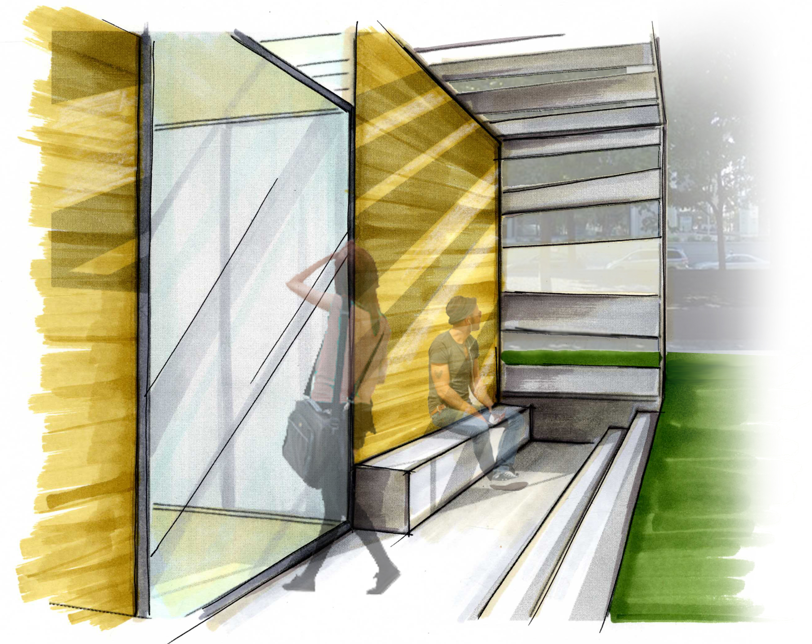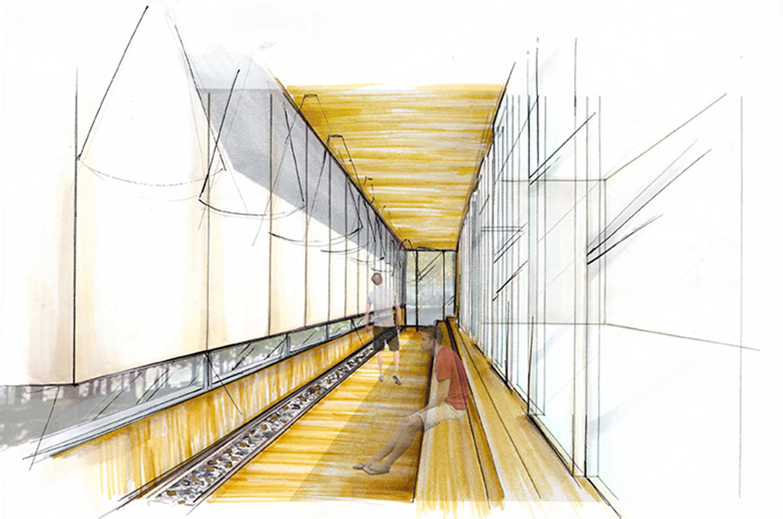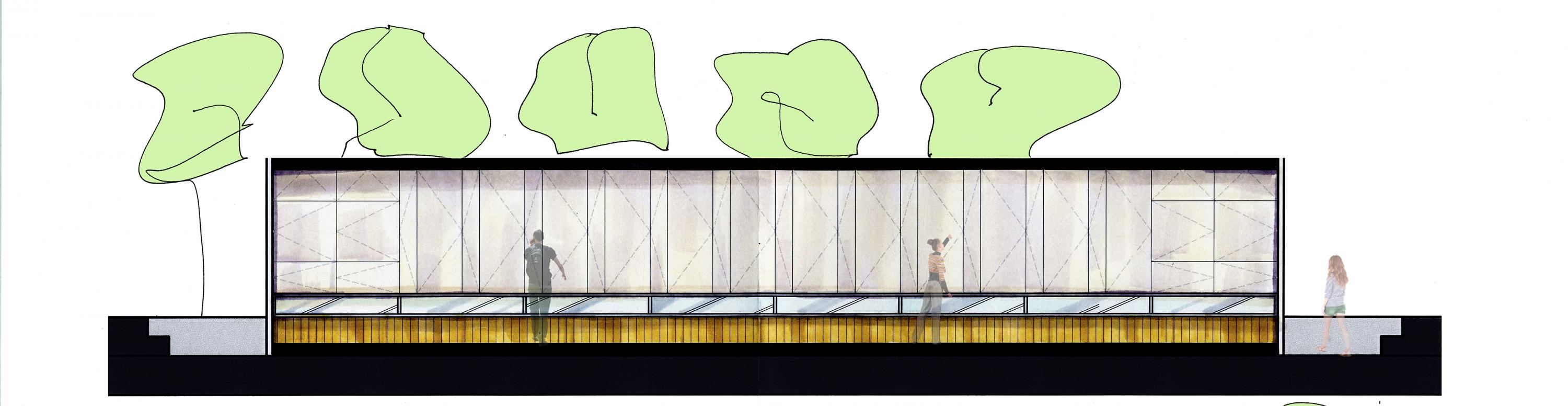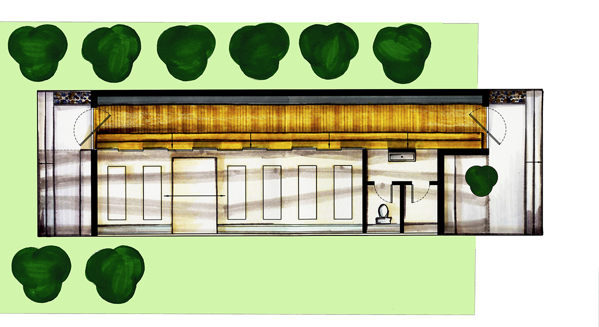 Implantés dans divers quartiers de la métropole, ces centres novateurs visent à optimiser leur utilisation par l’accessibilité de leurs emplacements stratégiques. On crée un lien d’appartenance avec l’usager qui peut se ressourcer à même son milieu de vie. Dans ce projet-étude initialement situé au square Victoria, l’expérience du bâti se retrouve intrinsèquement liée avec la linéarité de l’espace. Tel une artère ajoutée à l’environnement, le centre devient en soi un nouveau passage dans le parc et offre une dimension esthétique minimaliste où seul l’essentiel est présent. En raison de son sens premier, l’espace intérieur offre un lieu simplifié et élémentaire divisé en deux zones distinctes et contrastantes par leur matérialité. Dès l’entrée, l’usager se sentira enveloppé par la zone de circulation rehaussée de bois alors qu’il se verra transporté dans une ambiance ultra lumineuse dans la zone studio constituée entièrement de fenêtres. L’architecture extérieure vient définir l’espace dans son intégralité grâce à une structure ajourée qui laisse entrer la lumière naturelle. Celle-ci, en étroite relation avec l’expérience fondamentale du lieu, permet de faire ressentir à l’usager différentes sensations physiques telles la chaleur, la lumière et le mouvement.