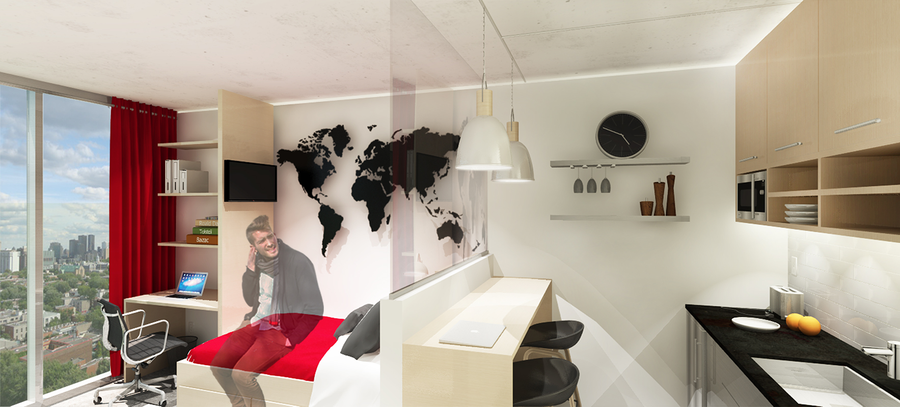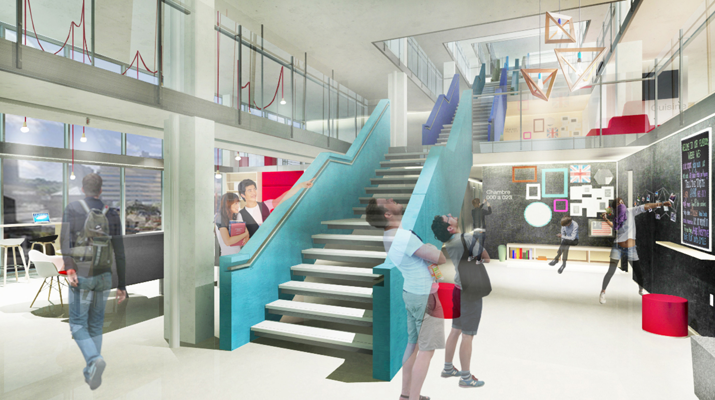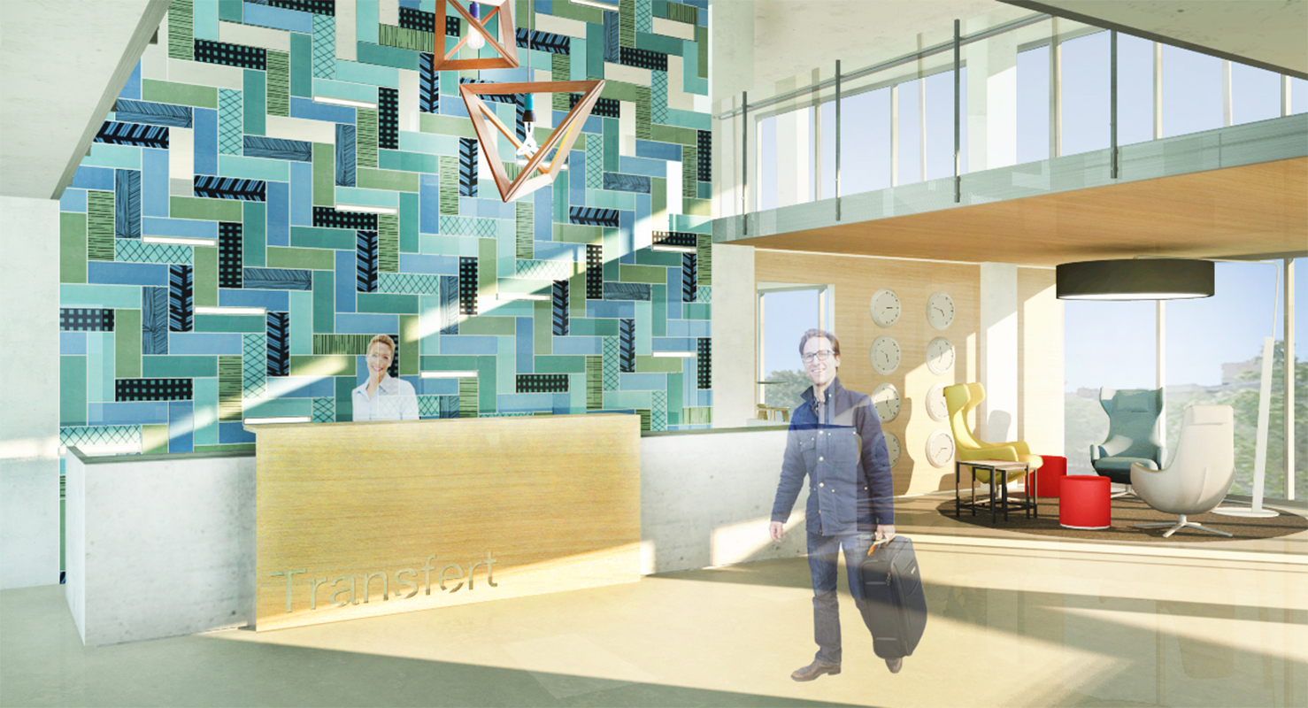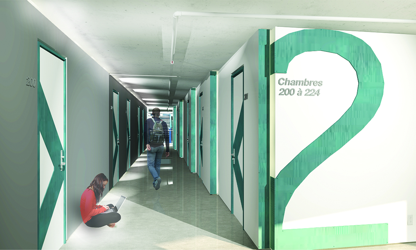 Située dans l’îlot voyageur, la résidence étudiante « Transfert » est conçue dans le but d’enrichir l’expérience étudiante étrangère à Montréal. Pour ce faire, le côté relationnel est mis de l’avant, favorisant les liens entre les résidents et accentuant par le fait même, l’apprentissage qu’ils viennent chercher ici.