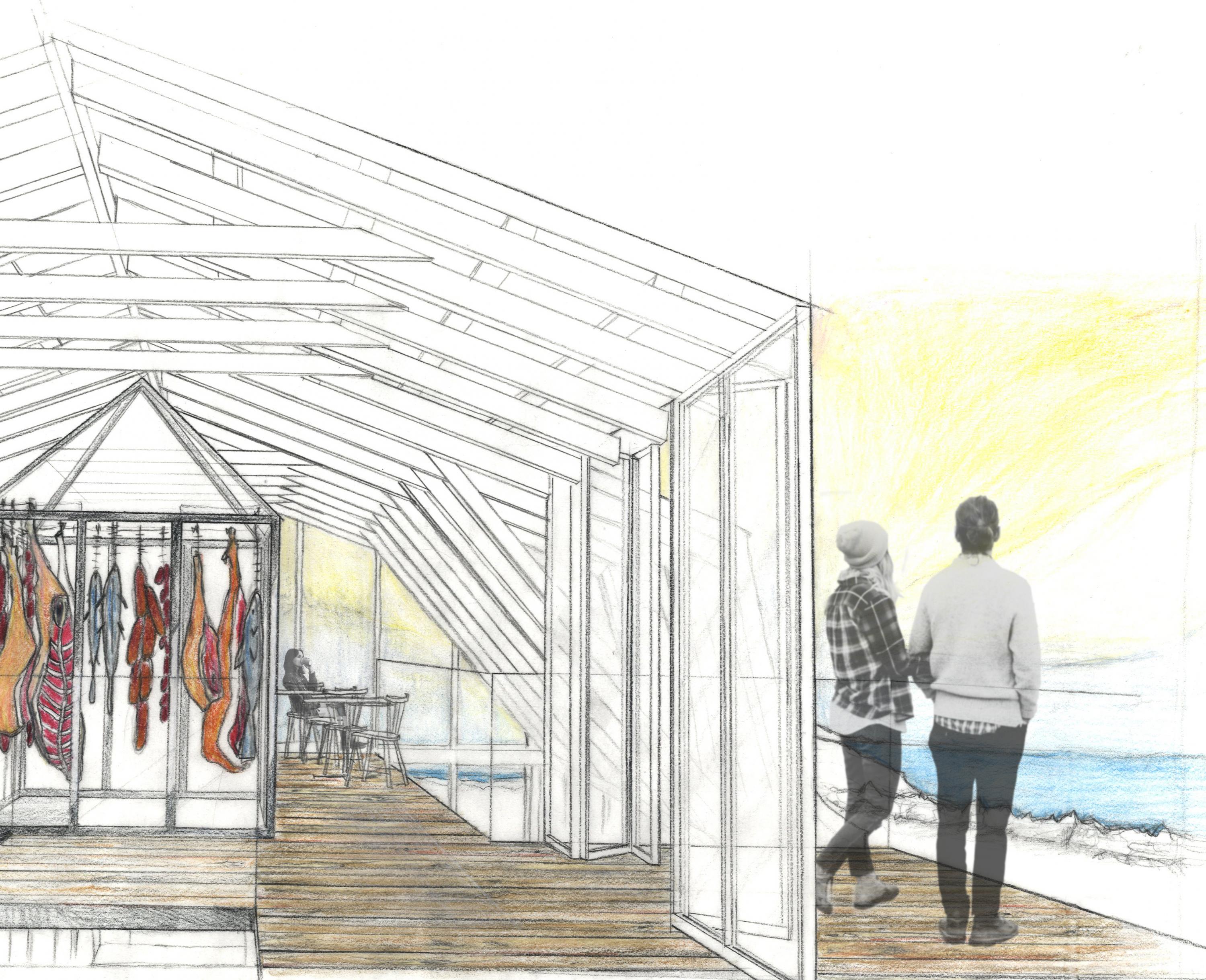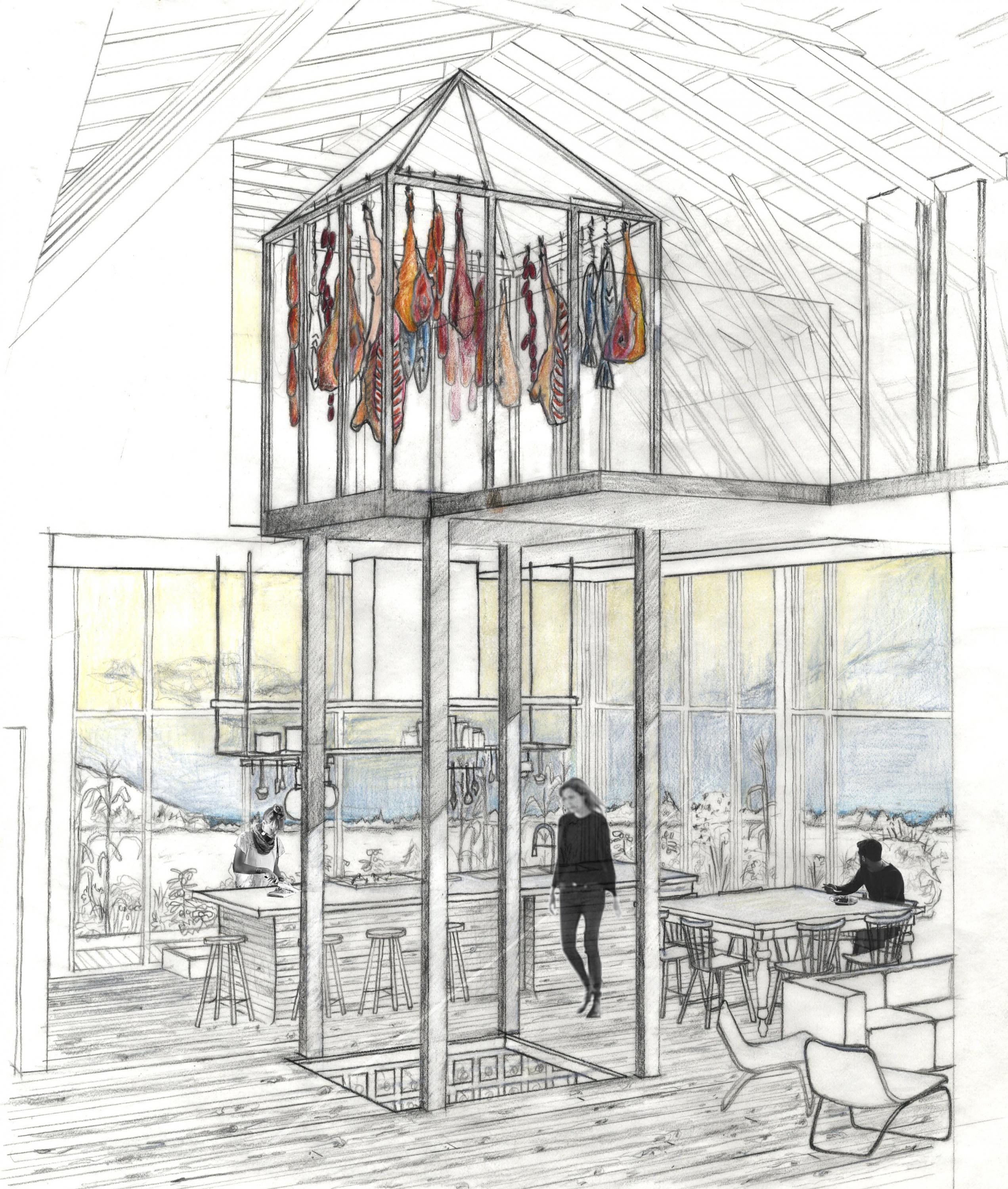 La cuisine est la raison d’être d’un tel lieu. Un potager est adjacent à l'habitation, car on souhaite que la personne qui cuisine (un chef invité ou encore l'hôte du lieu) puisse facilement parcourir et instruire les visiteurs sur les produits qu'il utilisera. Par l'aménagement, on souhaite voir disparaître le protocole formel séparant le chef cuisinier de ses invités et transformer l’expérience en un parcours instructif et collaboratif. De plus, l’idée originale et inspirée d'élever la chambre de vieillissement des viandes au deuxième étage démontre une volonté de marquer le visiteur et d'imprégner le lieu de sa vocation, c'est-à-dire la découverte des produits du terroir.